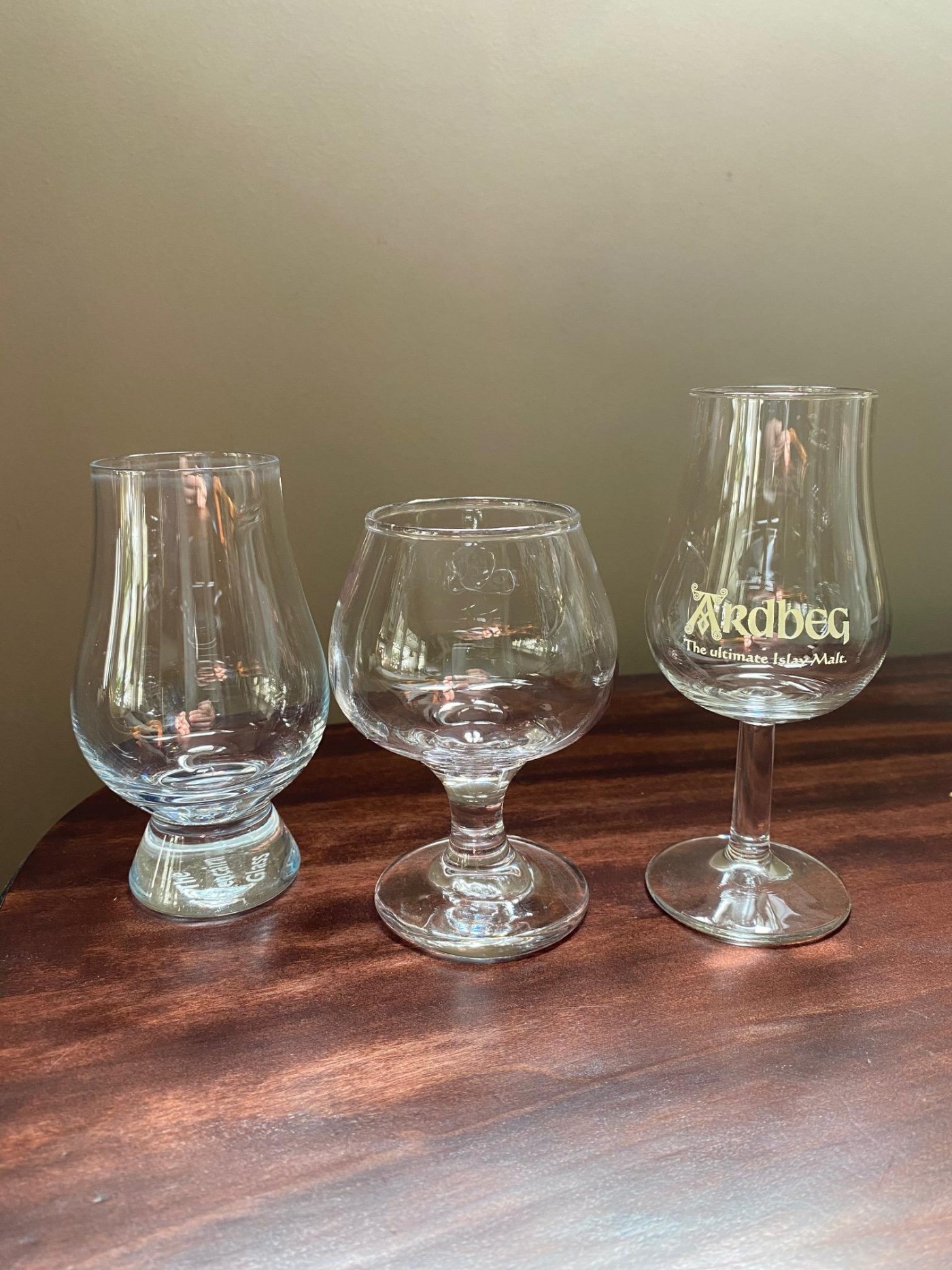 Side note: I am not a fan of the standard Glencairn. I pictured it below to show you how much deeper it is next to the Ardbeg tulip and brandy snifter. I just never feel like I can get my nose into the liquid enough.