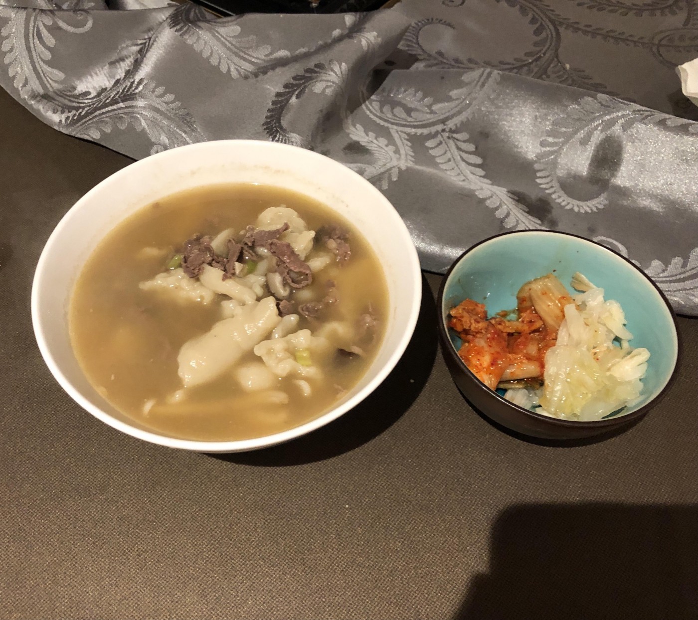 Friday night we had a Chinese hotpot for dinner. Tonight, with the leftover broth, I added some of the leftover meat sliced thin and made 수제비, hand torn noodles, served with white and red kimchi drizzled with a touch of sesame oil.