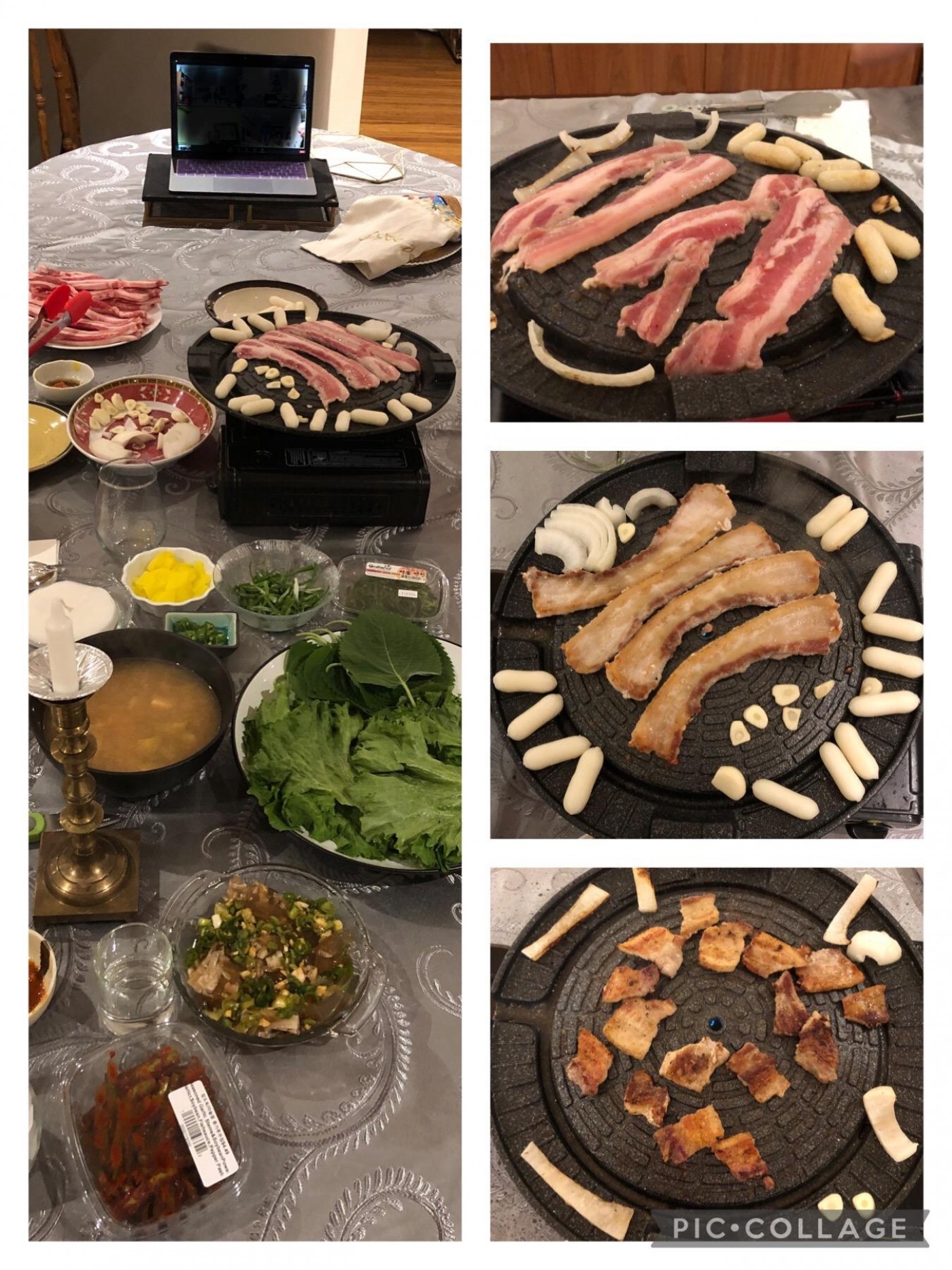 My wife came home with a grill pan, 삼겹살, or sliced pork belly, and a bunch of sides, so we had Korean table BBQ at home (with all the fans on and windows open to avoid the smoke alarm or CO poisoning). It was delicious. We also grilled some rice cakes that were filled with cheese. Not sure I understand why...