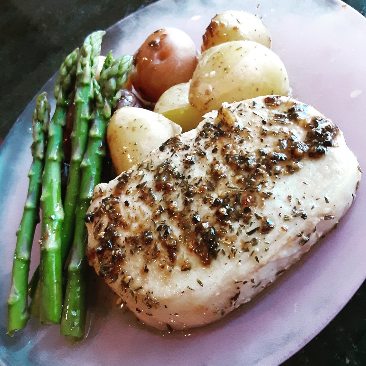 Pan Fried Pork Chops with a Welsh Whisky Reduction (using Penderyn Celt), served with asparagus and baby potatoes...