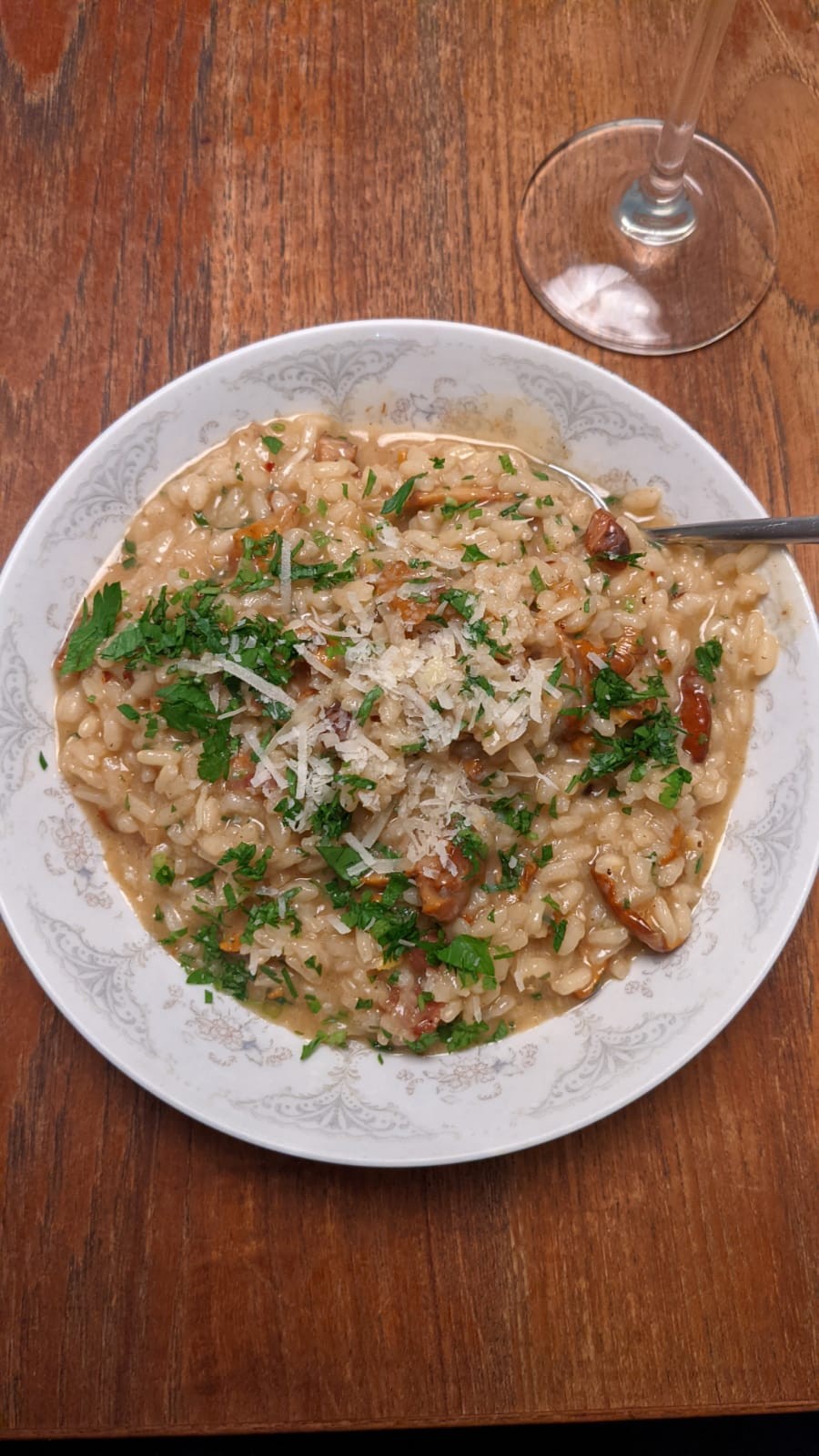 We cooked some pancetta and shallots and then sautéed a whole mess of Chanterelles mushrooms in the fat. This was added to the risotto in the last 1/3 of cooking.