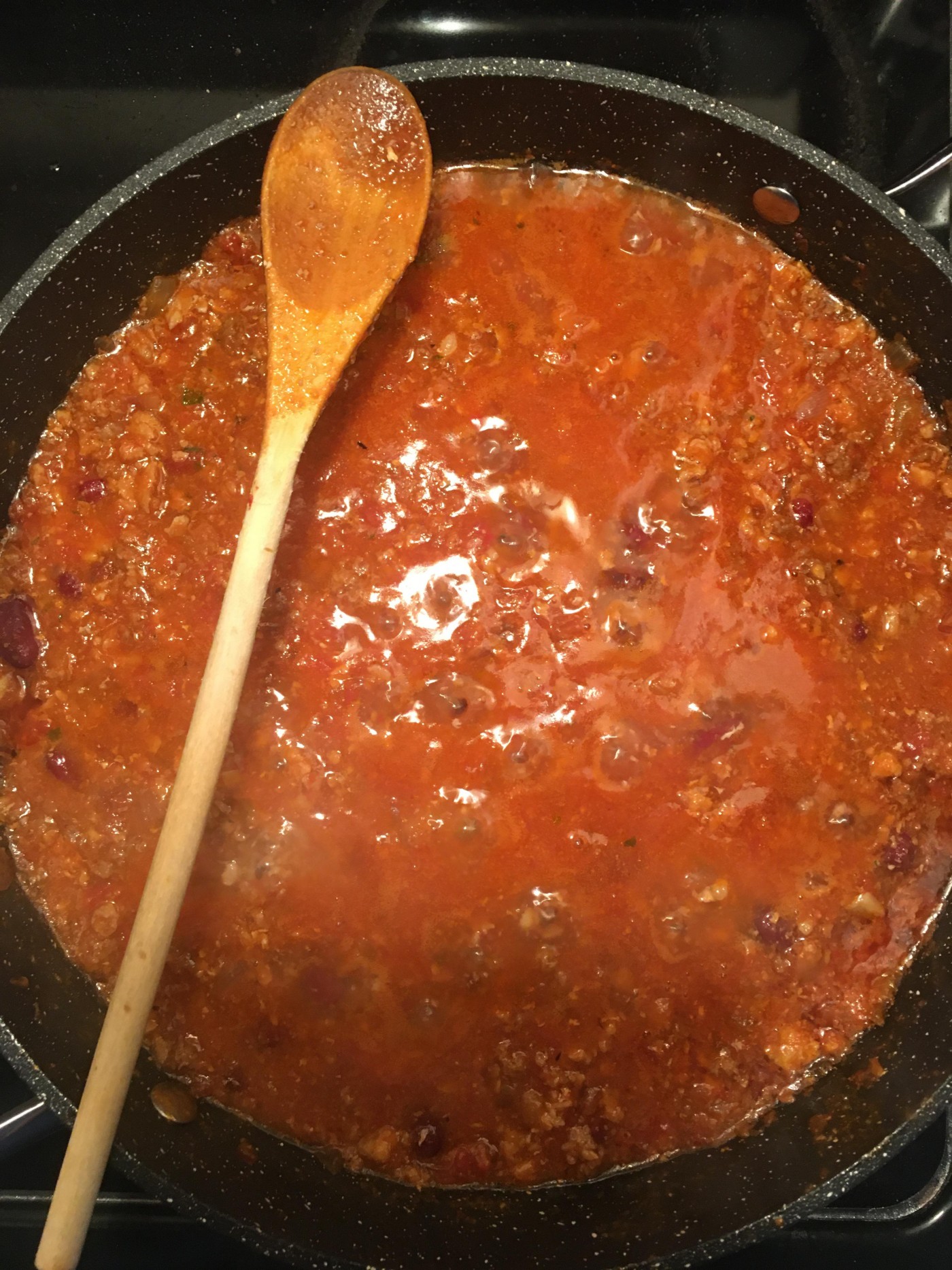 @casualtorture, I am infested with tomatoes, four varieties. Reducing (pun intended) my tomato inventory with a pan of simple chili, all ingredients are local.
