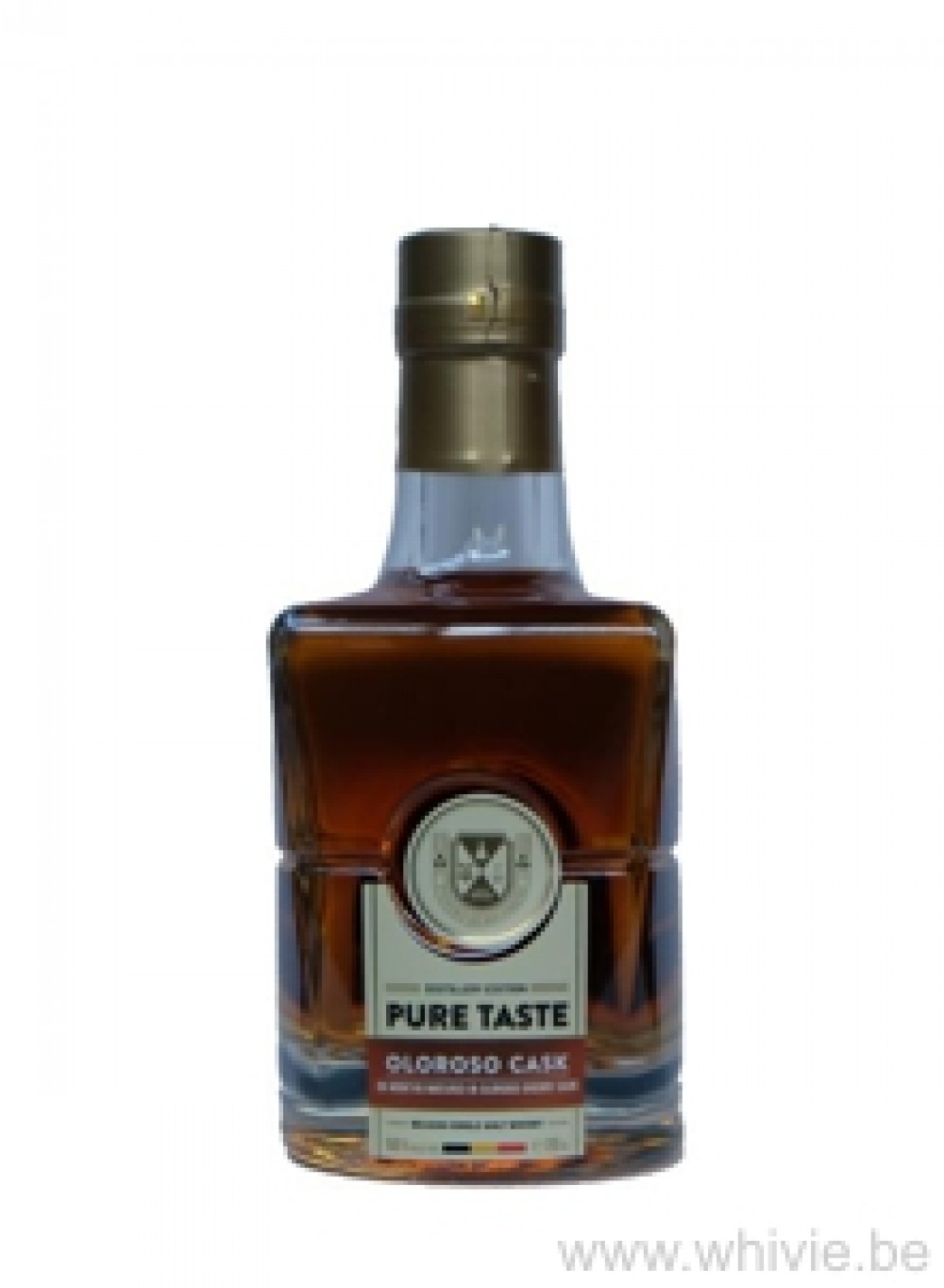 The third and final distillery exclusive in the Gouden Carolus' Pure Taste range, sold only in the visitor center of the Molenberg distillery, is again one of 36 months old. There are 3 different releases in bottles of 200ml, all three matured matured on a different type of cask: bourbon, the Anker cask and Oloroso. We will try the oloroso matured version, bottled at 50% just like its twins. The color is the same as the one from the Anker cask. The nose is sweet and creamy, but cannot hide (should not either) its young age. I can smell the barley and the yeast, but almost nothing from the sherry cask. There is a bit of fruit there – of the yellow and orange variety – but that is overpowered by something like goat cheese and stable scent. Not the most charming nose, to be honest. The body is almost creamy, which is just fine. Spicy too. Again, fine. But the taste is a bit of a let-down. It makes me pull faces. It wants to be sweet on something of sultanas and apricots, but quickly turns somewhat sour and mostly bitter. Ouch. That bitterness becomes quite big in the fairly long finish. But it does not make me happy. In all honesty, I had higher hopes for this oloroso matured Belgian malt. Pity. It is unpolished and unbalanced, bittersweet and… not worth the effort.