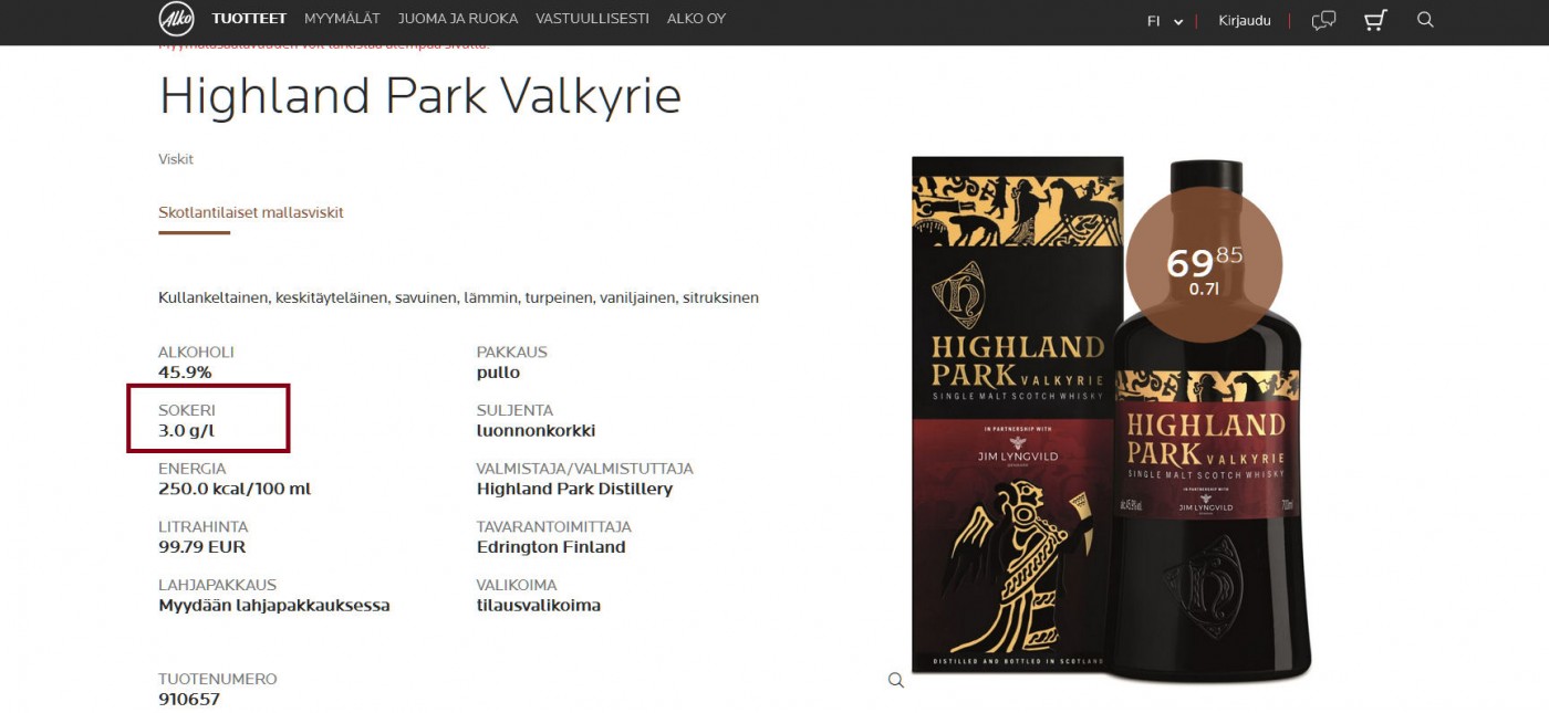 What ALKO does is they measure sugar content of everything they sell. This feature basically allows me to avoid such things like bad rum. ALKO lists Valkyrie having 3.0 g/l of sugar in it. It's not much, but I haven't ever seen sugar in a whisky before, not ever. Not even in the heavily sherried ones.