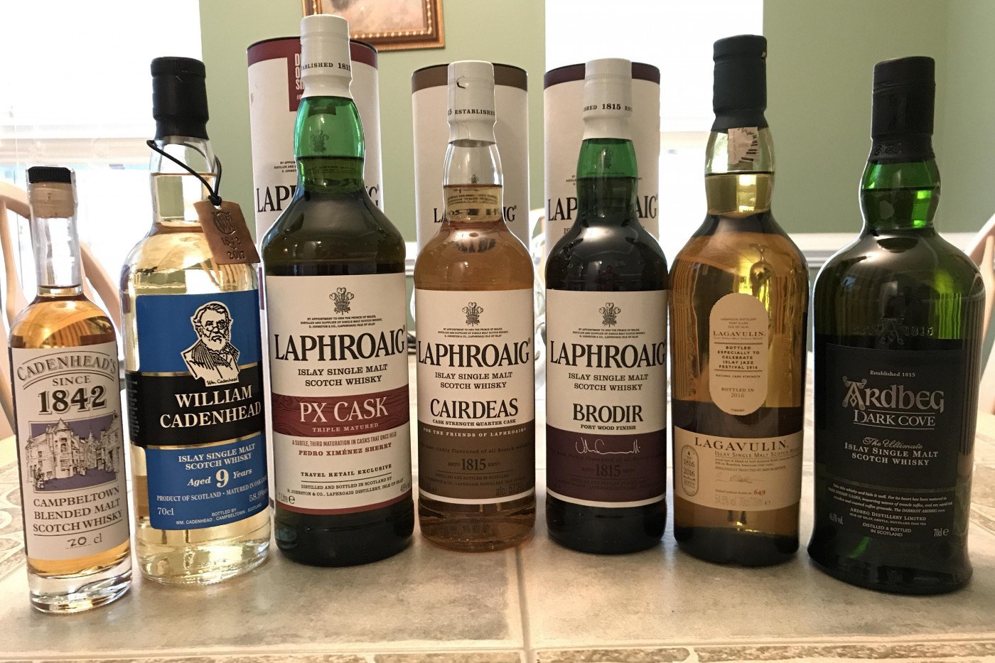 @MadSingleMalt Yes... the bottle on the left was filled at the store out of a cask labeled "Cambletown" but I was told it is 100% Springbank. The larger blue Cadenhead bottle is labeled 9-year old Islay, and is from Lagavulin. The other interesting bottle here, in my opinion, is the Lagavulin bottle... it is from the 2016 Jazz Festival. The Laphroaigs I bought based on being hard to find or Duty Free exclusive and at Ardbeg they told me they only have about 100 bottle of the Dark Cove left... but I did see a bottle in a store about 30 minutes from me the other day... if I had known that, I would have grabbed something "distillery-only" instead.