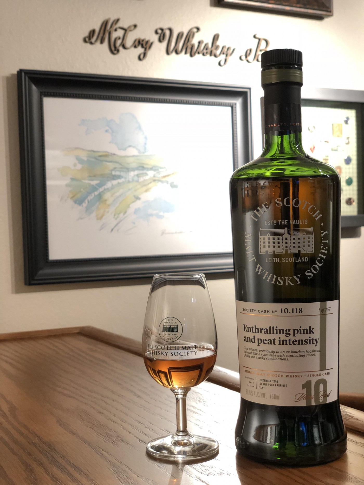 Just getting acquainted with a recently purchased and now opened bottle of 10 year peated Bunnahabhain (SMWS 10.118) "Enthralling pink and peat intensity". After spending the first 9 years in an ex-bourbon hogshead, it was finished the final year in a first-fill Port barrique cask. Wow! It is so perfectly balanced. Can’t wait to see what a little air does to this one!