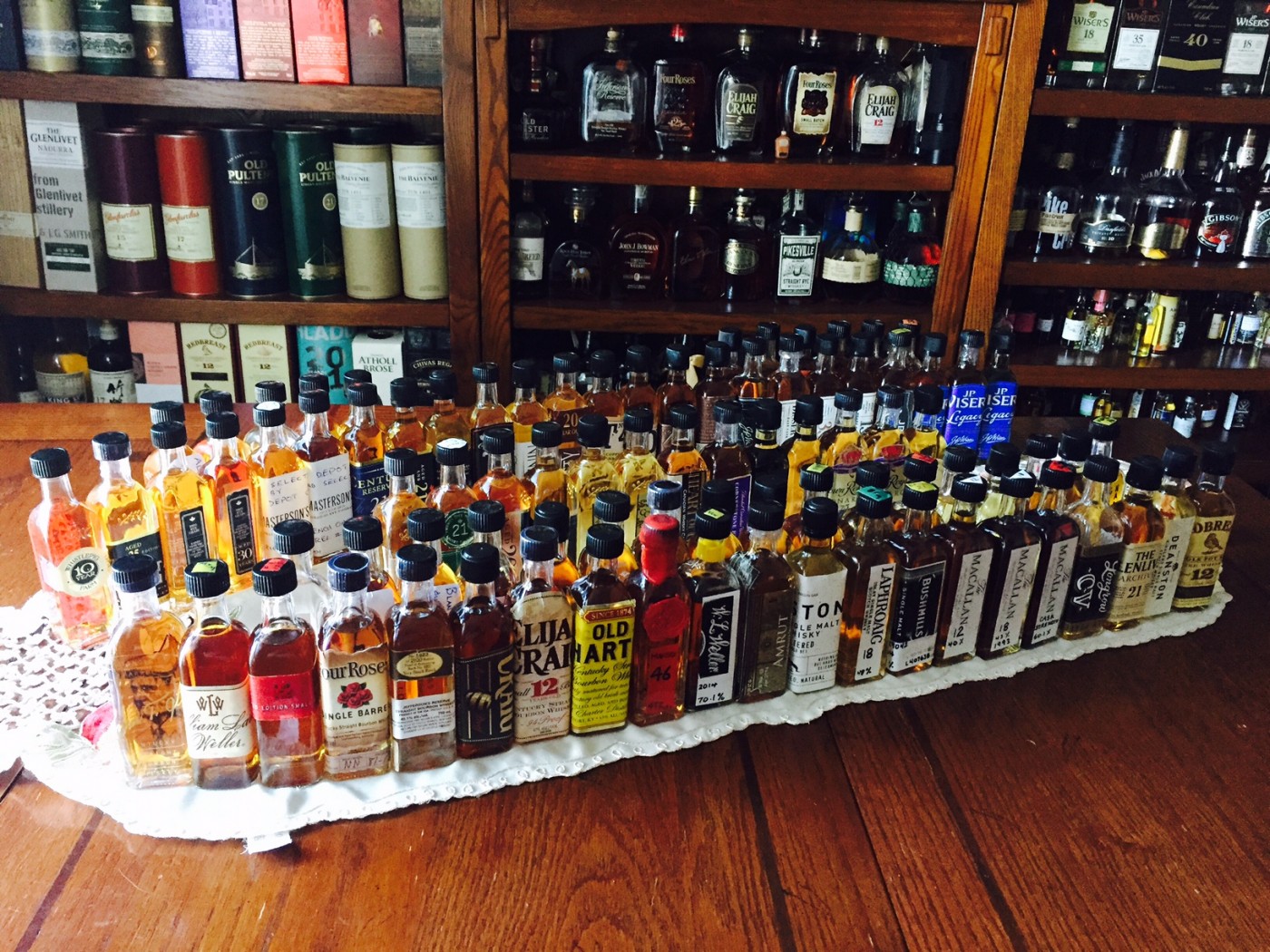 @archivist, Saturday mornings are a great time for me to pour samples and procure labels. My children are now adults, Mrs. paddockjudge sleeps late on weekends, and I find this the perfect opportunity to "play whisky". Sometimes I blend. The most recent round of blending was Little Book Chapter 2 using CC 40 YO, Knob Creek Cask Strength 8 YO Rye, and WhistlePig 10 YO single barrel. Having 60 ml mini bottles of each of the component parts ready to go makes for easy portability. While attending university I worked for three years in the library (when micro-fiche and telex were high tech) in Serials, Periodicals, and Archives. I suppose some of that rubbed off on me....I often refer to my whisky cabinet as The Reference Library.