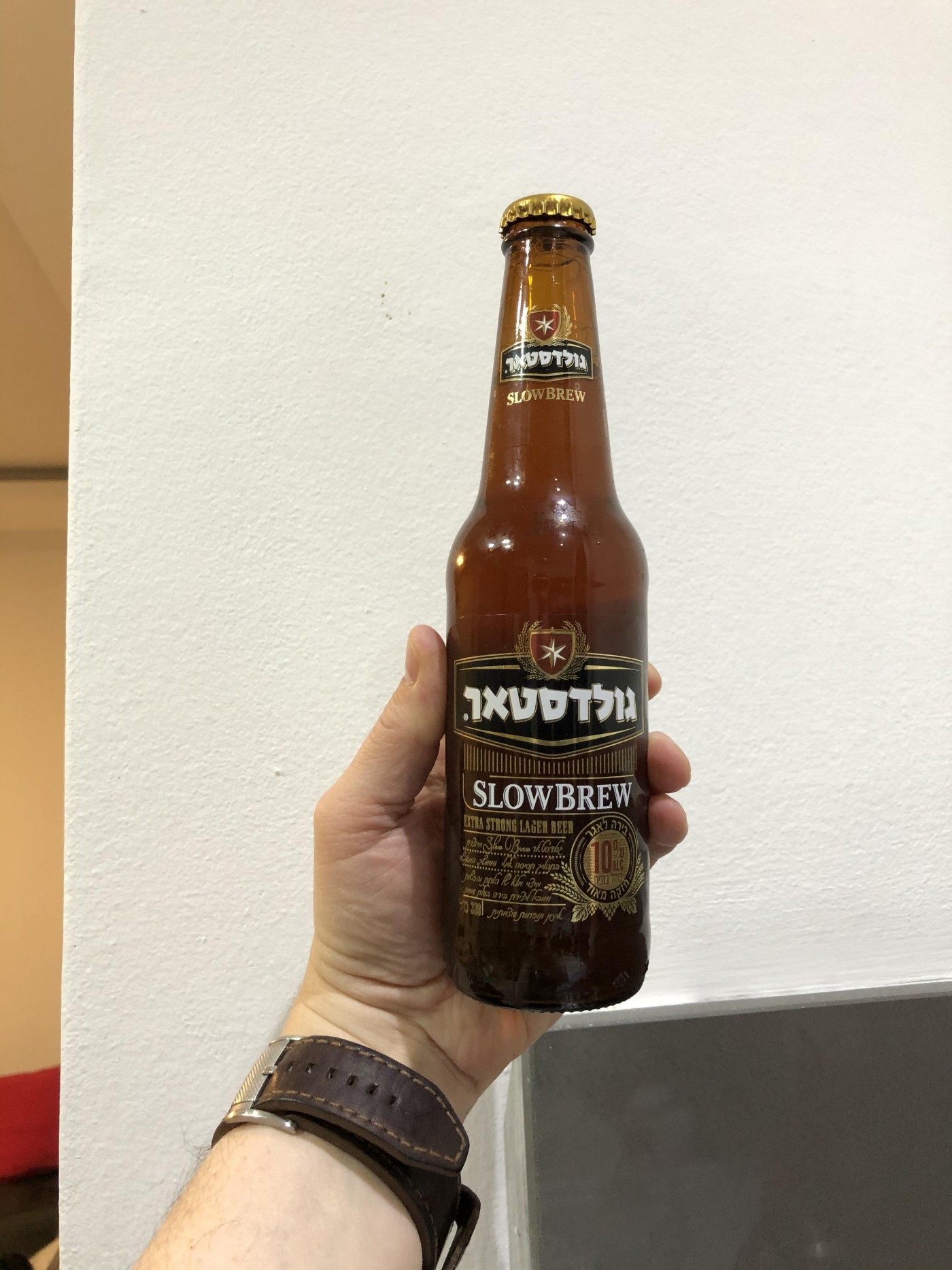 Have to work up those liver enzymes for Tuesday’s visit to a distillery so tonight it’s this one. This Goldstar is 4.9%, so not as powerful as the slow brew, but it retains its malty core. I think I prefer the slow brew but the store here really didn’t have the same variety as the one in Eilat.