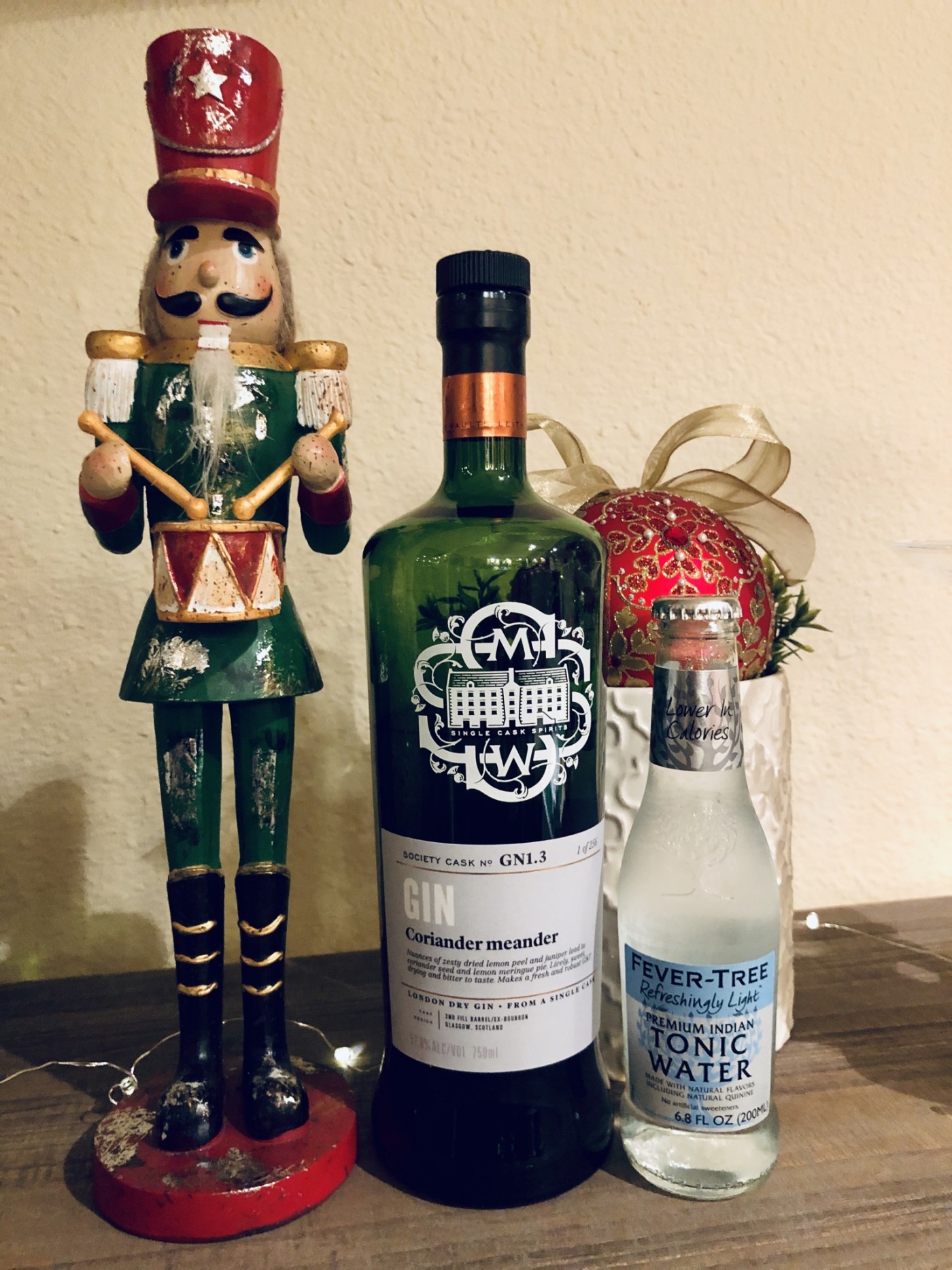 Last night on Christmas Eve eve, before dinner, I made Gin & Tonics with 3 parts Fever Tree Light Premium Indian Tonic Water and 1 part Society Gin (SMWS GN1.3 “Coriander meander”) distilled in Aug. 2017 at Makar in Glasgow, aged in a second-fill ex-bourbon barrel. 57.8% ABV.