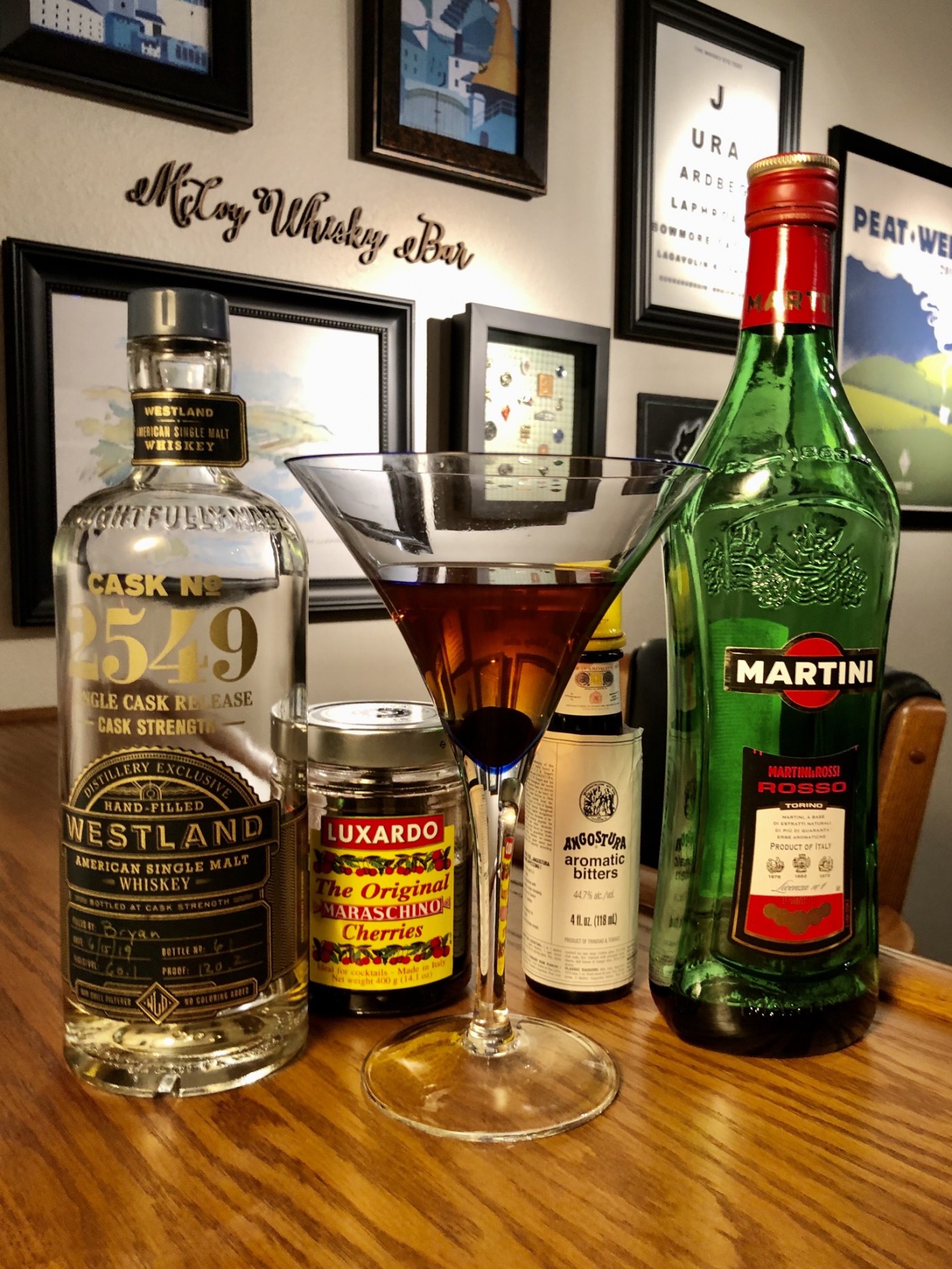 As a reminder, the recipe is 2oz Westland whiskey, 1oz sweet vermouth, 2 dashes of aromatic bitters and a cocktail cherry (I used a Luxardo maraschino cherry).