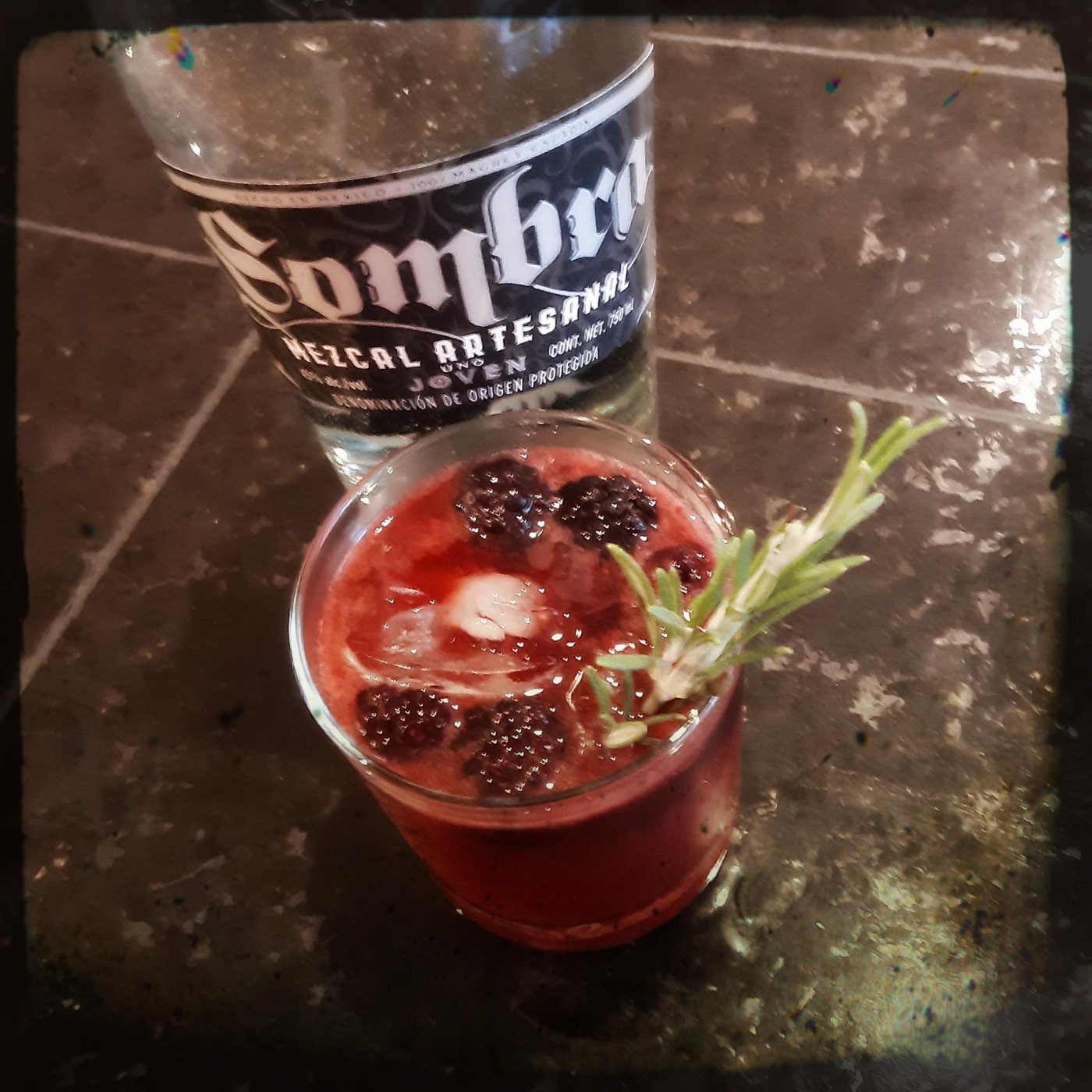 @BlueNote Muddle some blackberries and fresh rosemary with 1oz of lemon juice and 1oz of agave nectar, add 2oz of mezcal and a couple dashes of orange bitters, shake with ice, top up with soda, strain into a rocks glass over ice and garnish with more blackberries and a sprig of smoked rosemary.