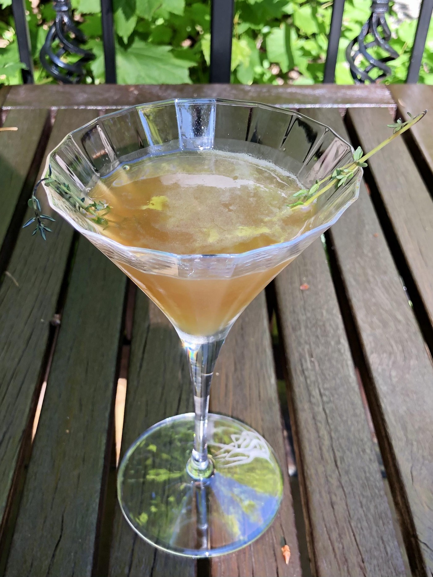 Today was my wife’s last day of work for (most of) the summer (she’s a teacher), so I made a new cocktail for us. “Thyme will tell”;