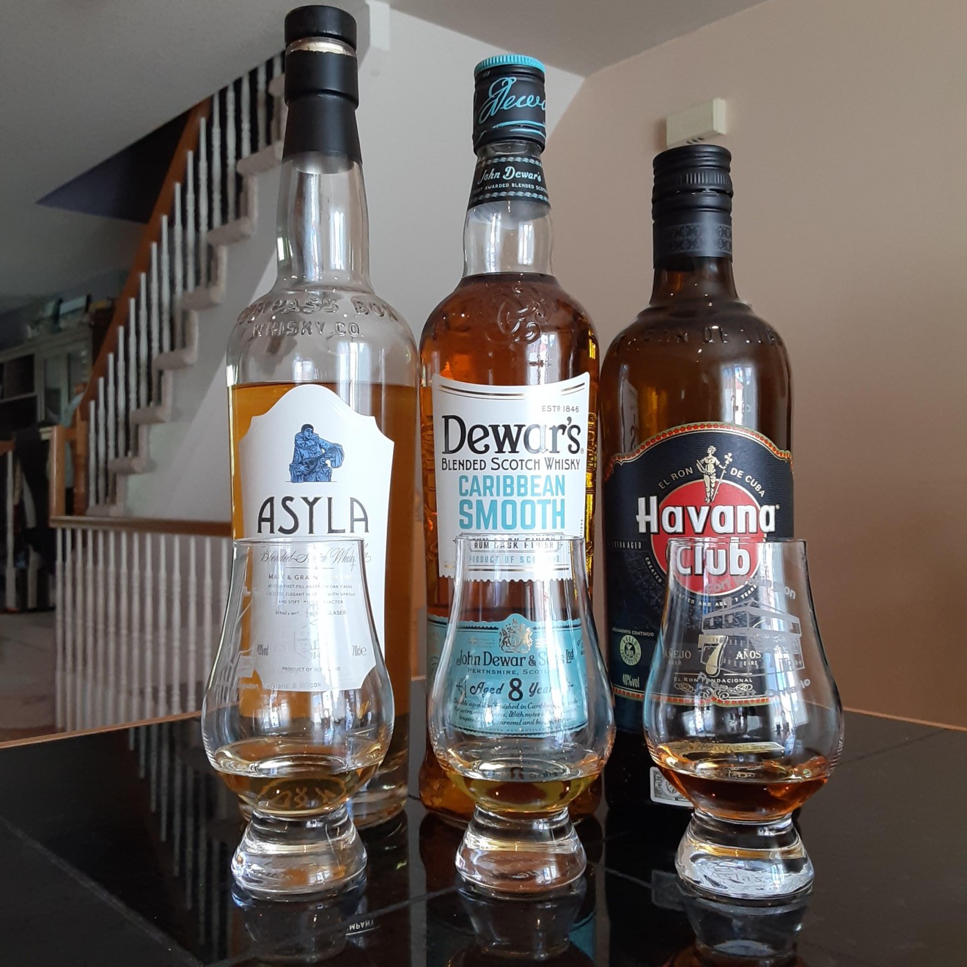 Phase One of my Great Summer Cocktail Experiment: getting baselines. Tasting a blended Scotch (Asyla), a rum cask finished blended Scotch (Dewar's Caribbean Smooth), and a rum (Havana Club 7 year-old).