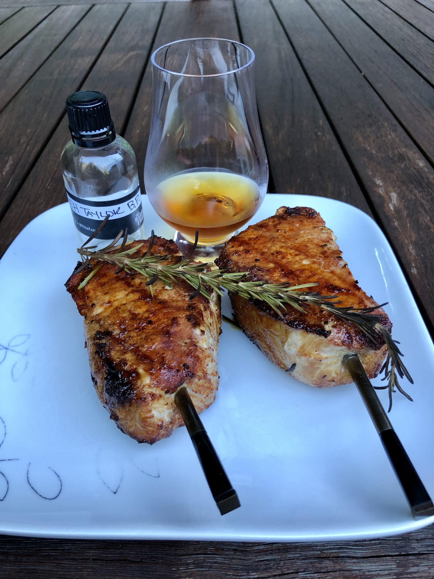 Tonight, I’m home alone and on my own for dinner. Grilled a couple of pork chops on the Weber with applewood chunks for smoke and a rosemary sprig.