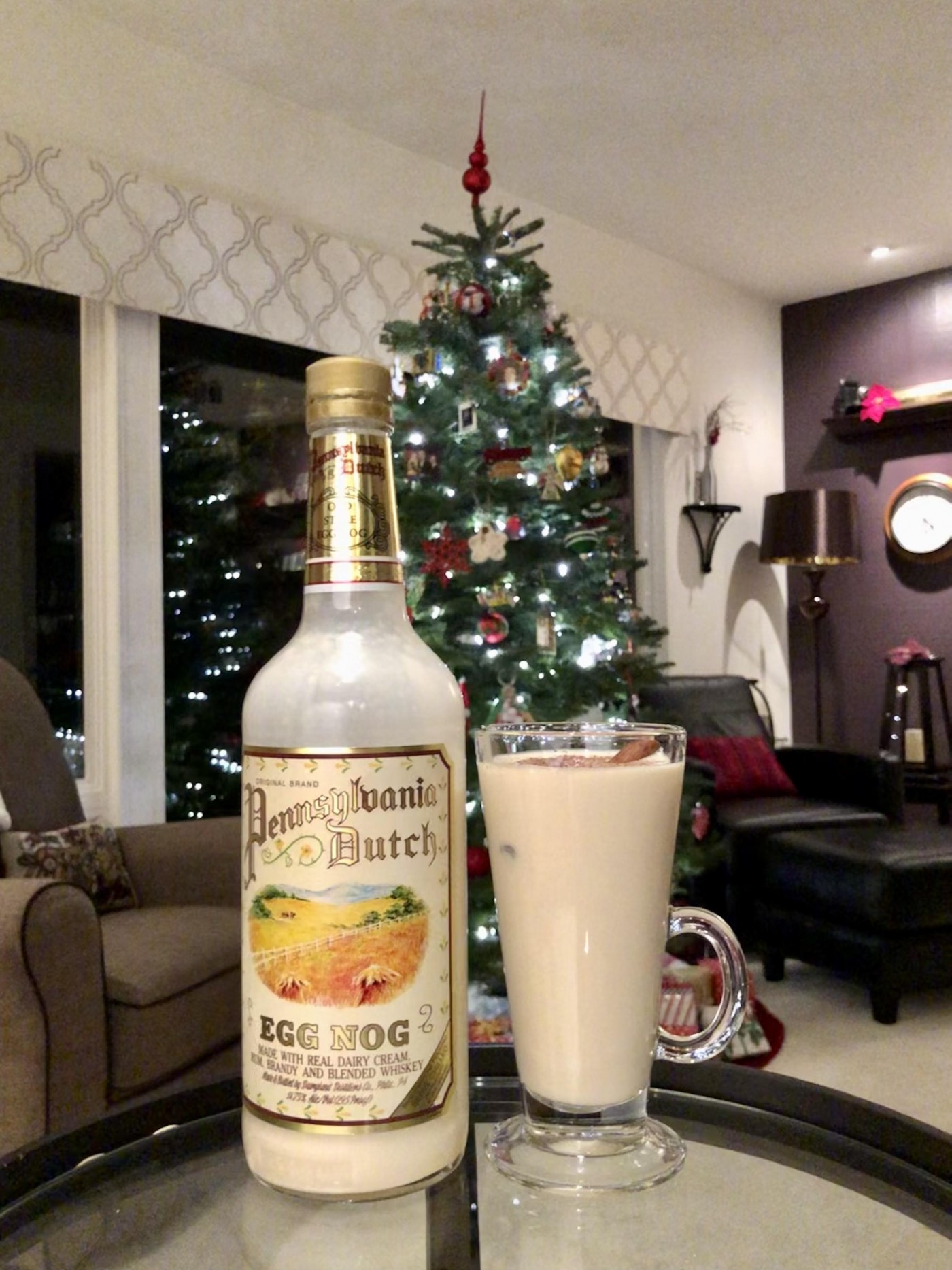 Pennsylvania Dutch Egg Nog. Per the label; “made with real dairy cream, rum, brandy and blended whiskey”, but it doesn’t list any brands. 14.75% ABV. It’s surprisingly really good. :-)