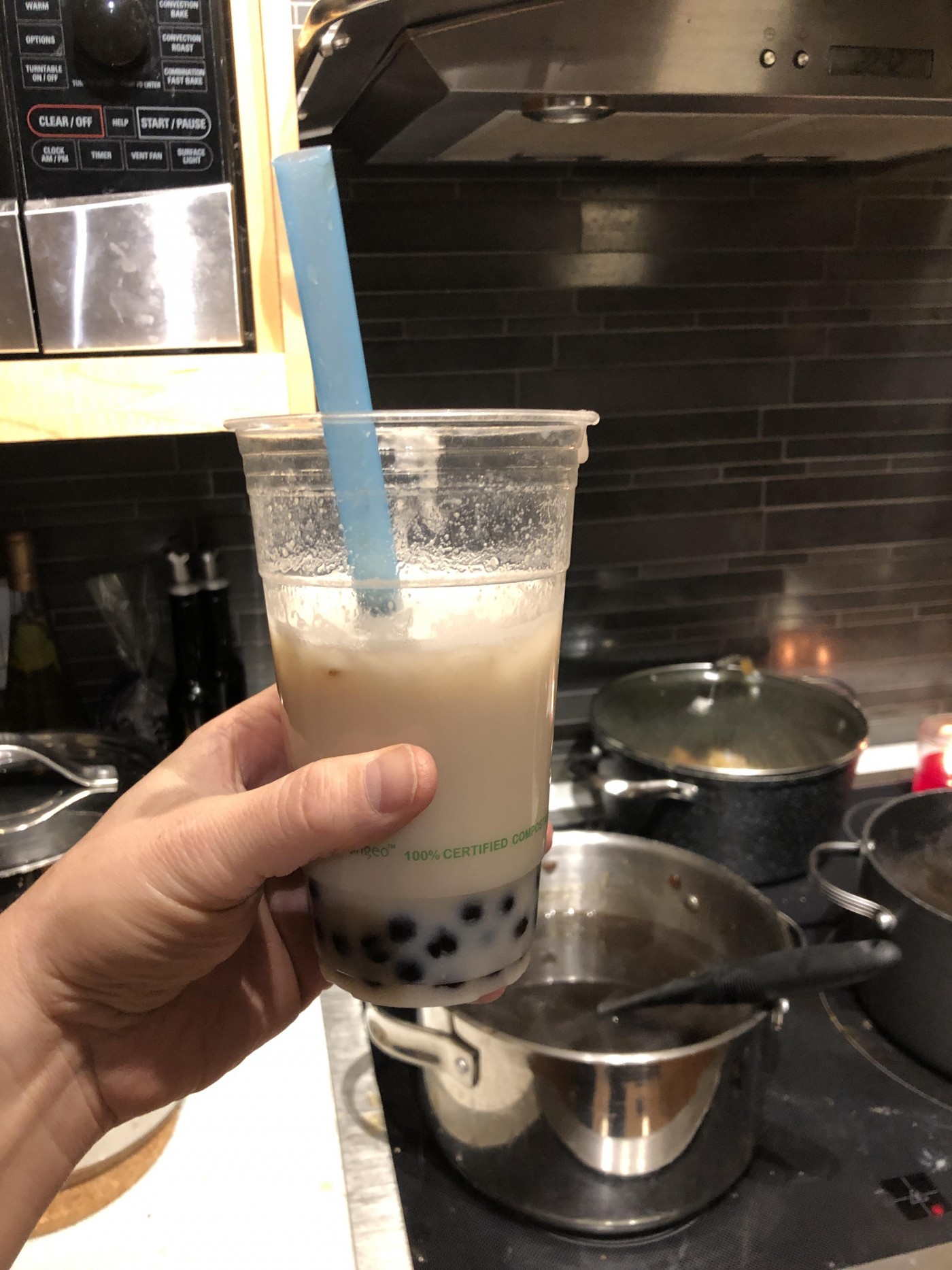 Homemade taro bubble tea. The taro was a root only a couple of hours ago. The bubbles were boiled today as well.