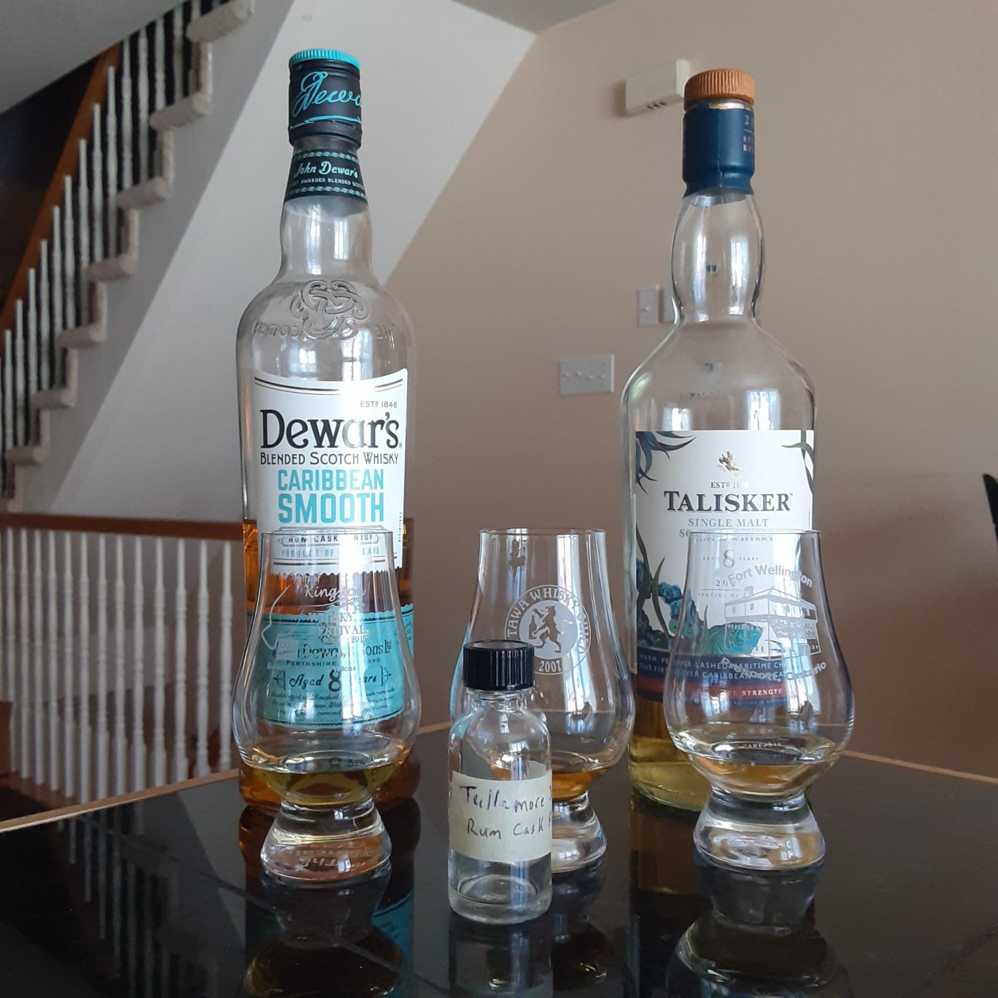 A small flight of rum cask finished whisky: Dewar's 8 year-old Caribbean Smooth, Tullamore DEW Rum Cask, and Talisker 8 year-old 2020 Special Release.