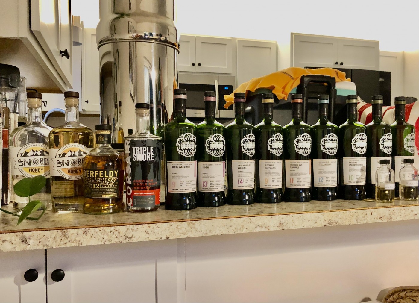 We’re visiting my older son and his wife at their home in Idaho for a couple of days. I recently gave my son a membership to the Scotch Malt Whisky Society for his birthday. In addition to some non-Society bottles, he’s added a couple of Society bottles to his collection since then. Additionally, I brought 7 Society bottles and 3 non-Society bottles with me to share with him.