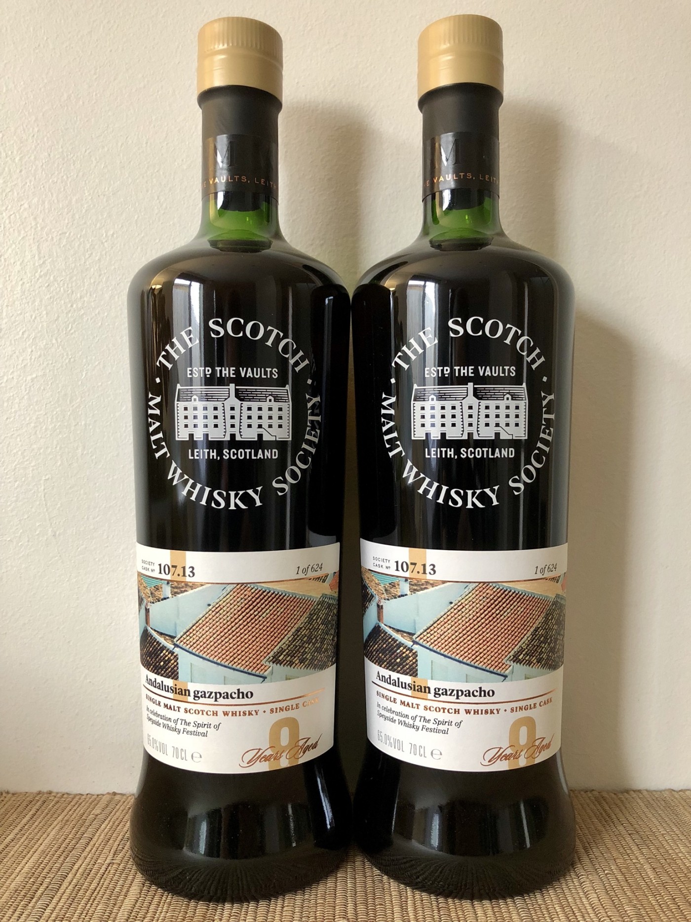 A couple of bottles of the SMWS 107.13 “Andalusian Gazpacho”. A 2008 Glenallachie matured in an ex-Oloroso cask for 9 years.