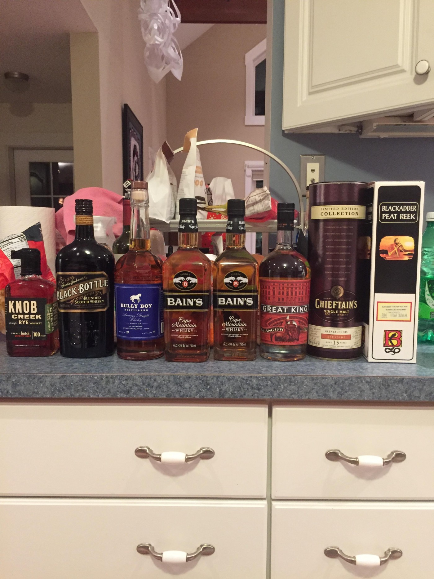 My recent haul from NH and Boston. As for why: -KCRye.. It was on clearance for $12. Great deal for nice Rye -BB.. Clearance for $18 -BBoy.. Was given to me for Christmas -Bain’s.. Clearance for $18.50 and I’ve enjoyed a bottle in the past -CBGlasgow.. Also clearance for $26 -Chieftains Glentauchers.. Picked up in Boston. Have never drank Glentauchers and it’s the darkest Scotch Whisky I’ve seen -BAPeatReek.. The store owner said that anything they rack into wood is excellent liquid