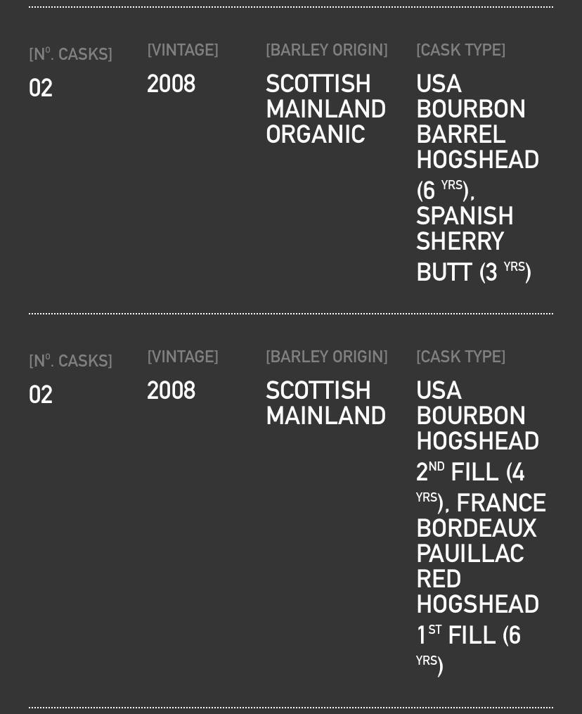 So I know that doesn’t add up to 100% but they’re estimations. I also didn’t take into account the different cask sizes, so the percentages could vary. Some of the 2008 vintage is claimed as a 10 year whisky on Bruichladdich’s page as you can see in the photo. I know not everyone likes to geek out with this stuff, but I feel it’s a great move on the part of Bruichladdich.