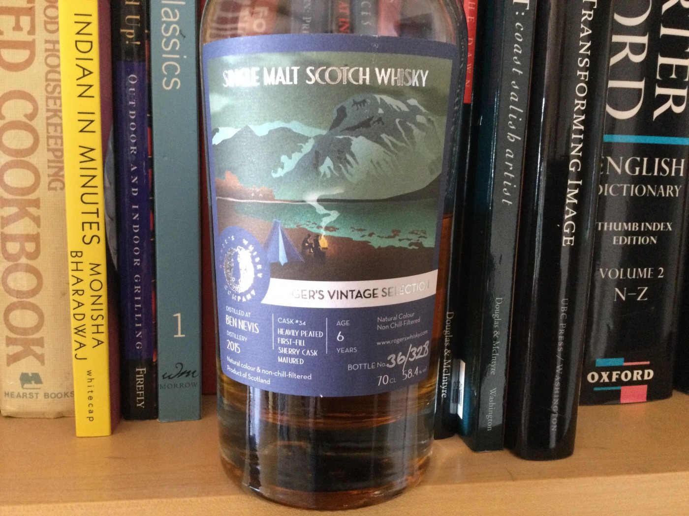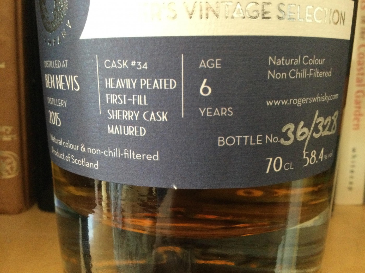 Just got my half of a bottle share on this 6 year old, heavily peated, sherry cask matured, cask strength Ben Nevis. It is imported from Rogers Vintage Selection, a bottler located in the Netherlands and brought to Canada by a group called Single Cask Clan. I just had a small taste last night and my first impression is that it is worth every penny of its high price. When they say heavily peated they ain’t kidding. The sherry influence is pretty well contained, probably due to the short time in the cask.