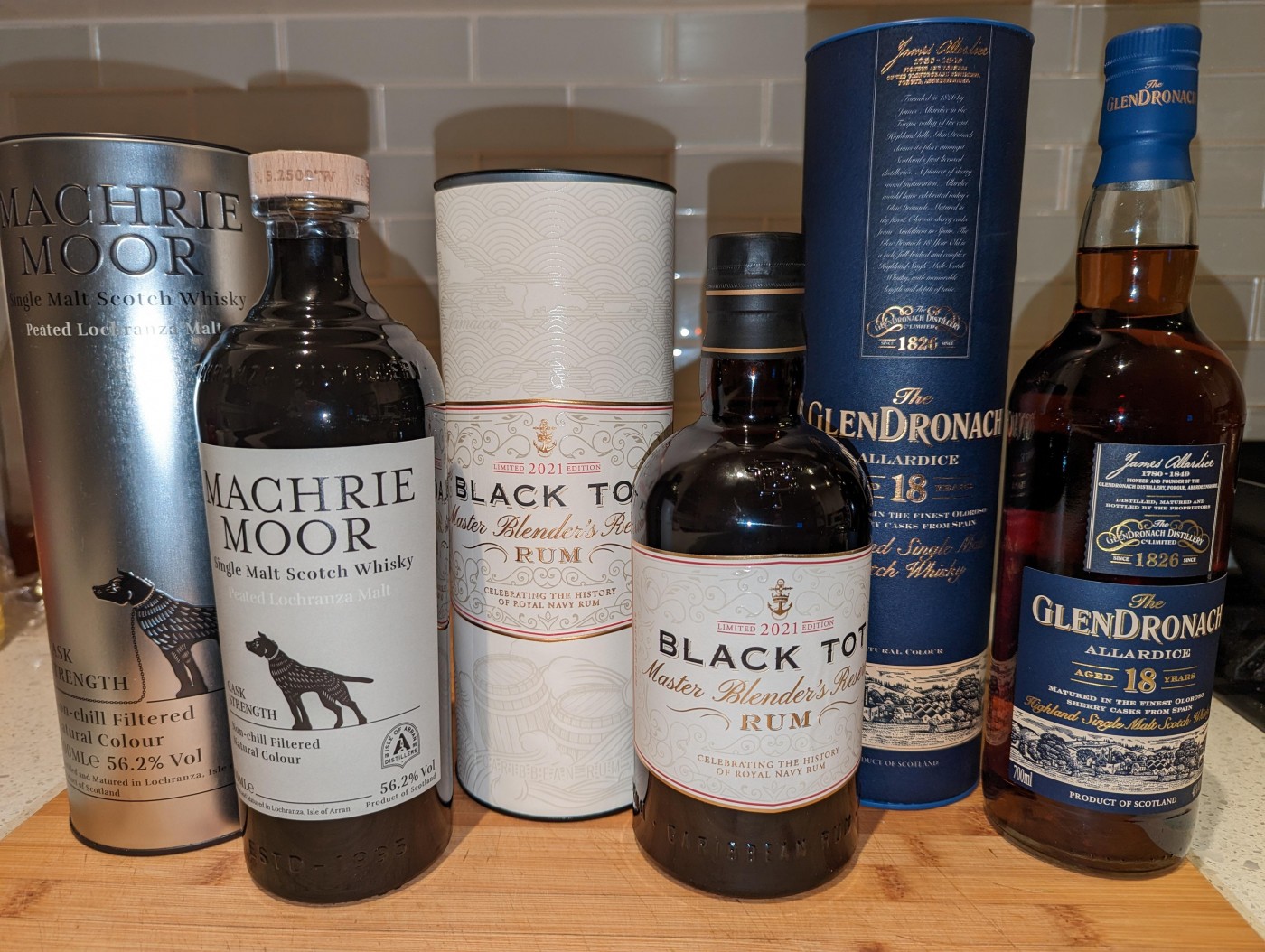 The Arran Machrie Moor Cask Strength for curiousity, a Peated Arran. The Black Tot Blender's Reserve 2021 because the blender, Oliver Chilton is doing an excellent job producing some tasty rums, in the series so far. The Glendronach 18 which is "officially", 18 years old beginning in 2020. This one is a 2022 bottling under the ownership of Brown-Foreman / Rachel Barrie. It comes with controversy and changes - upsetting whisky vloggers.