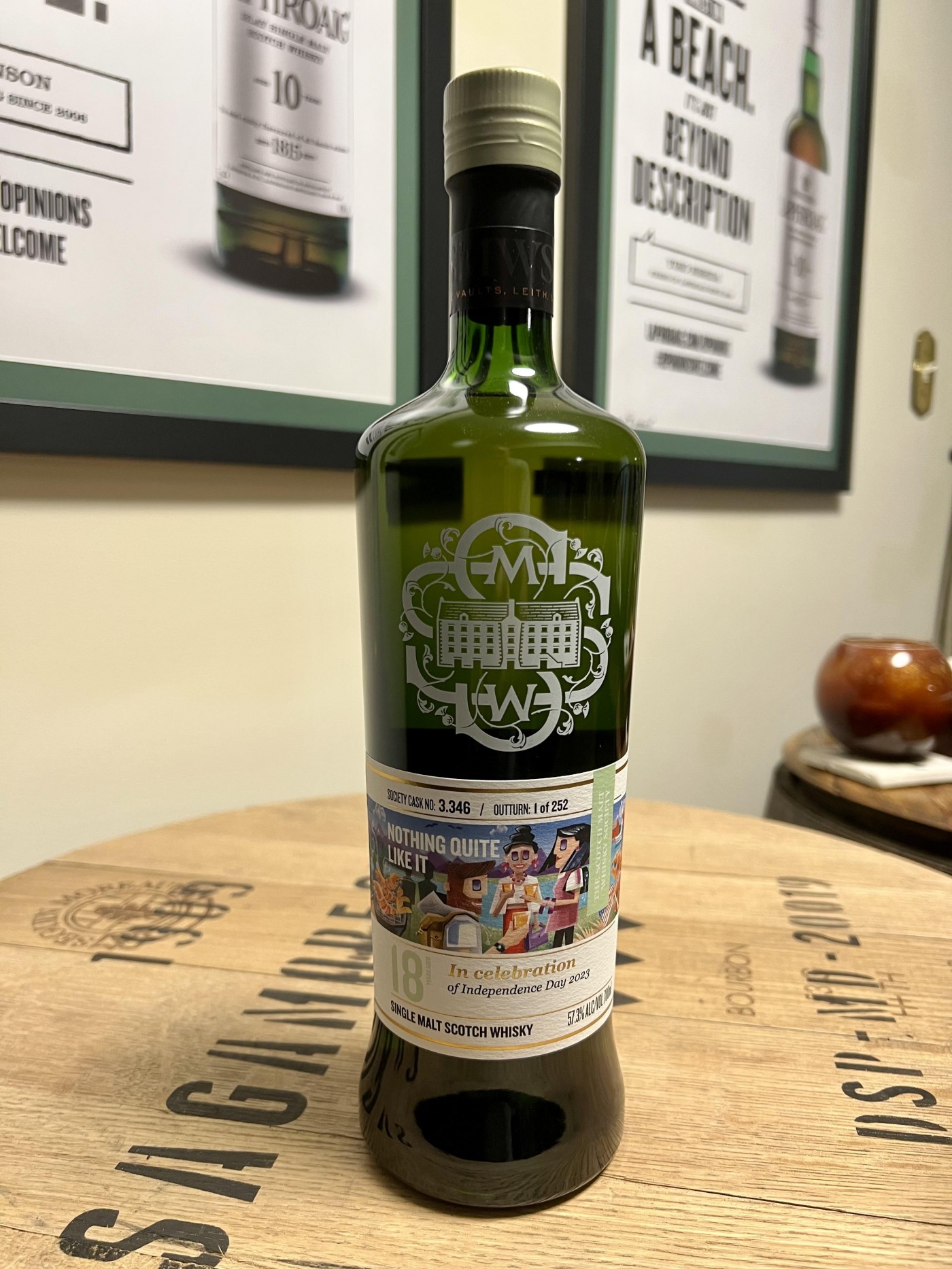 Islay SMWS 3.346 (18 year - Feb. 2004) "Nothing Quite Like It" In celebration of Independence Day 2023 - Second-fill hogshead - 57.3% ABV. Why? I won the lottery to buy a bottle (only 252) and it is from Bowmore where I had one of the best tours while on Islay with my dad and brothers. I hope to get them all together again and share this with them.