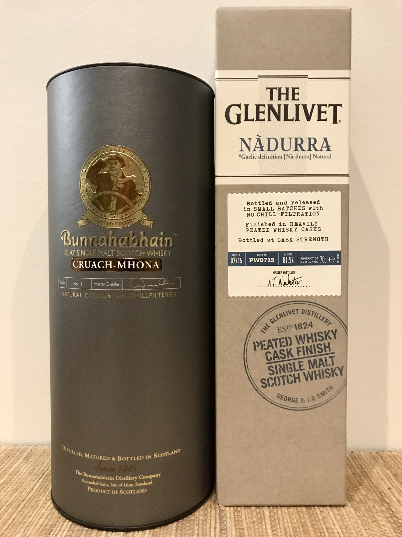 Some recent whisky purchases: - a litre bottle of Bunnahabhain Cruach Mhona, batch no. II - a bottle of the Glenlivet Nadurra Peated Cask Finish, batch no. PW0715