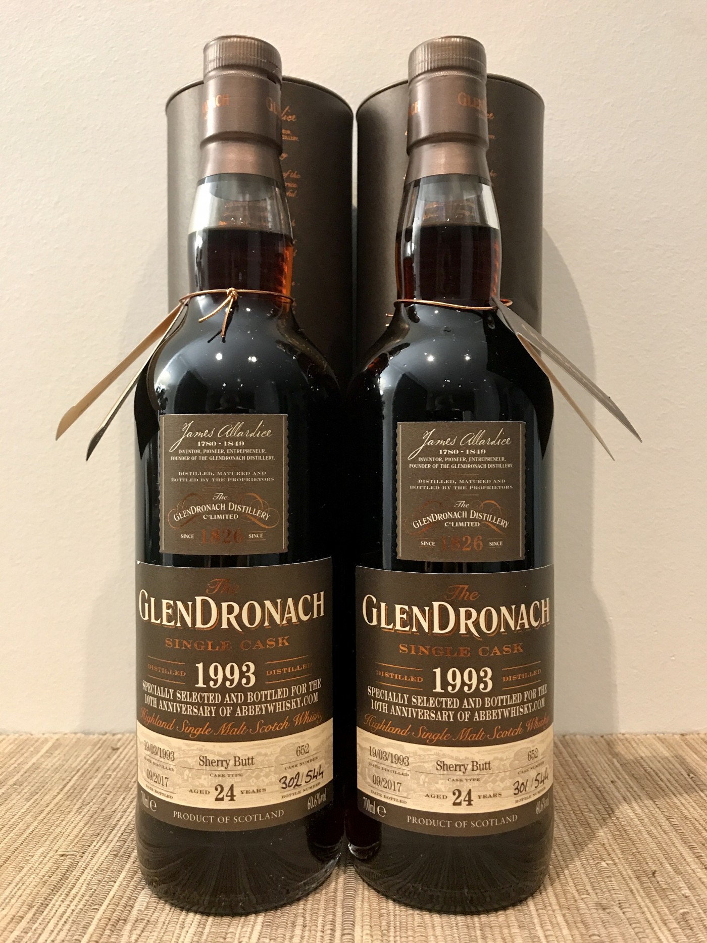 A couple of bottles of the 1993 Glendronach 24 Year Old from sherry cask no. 652 - amazing colour.